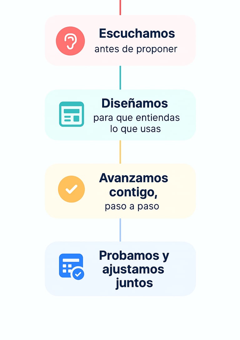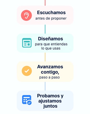 No hablamos en código ni usamos tecnicismos innecesarios. Te escuchamos, entendemos cómo funciona tu negocio y construimos soluciones que te ahorran tiempo desde el primer día.